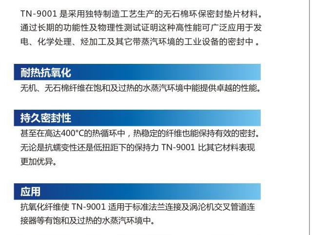 Application: antioxidant fiber makes tn-9001 suitable for standard flanged connections and turbine cross-pipe connectors in saturated and superheated water vapor environments.