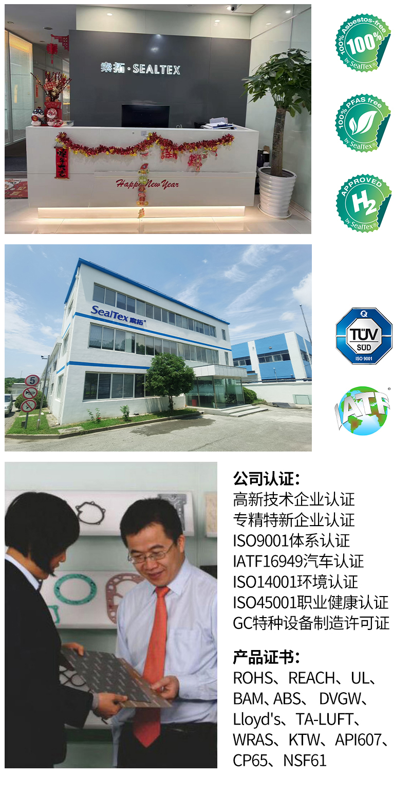 SealTex上海一柯索拓密封材料有限公司長期致力于各行業(yè)用100%無石棉環(huán)保密封墊片和耐高溫隔熱產(chǎn)品的生產(chǎn)及銷售,作為高新技術(shù)企業(yè)和專精特新認證單位,參與國家多項與密封墊相關(guān)的標準制定,可協(xié)助客戶進行密封失效分析如面壓測試和有限元分析,密封墊的設(shè)計與選擇。公司通過ISO9001、IATF16949、ISO14001 、ISO45001體系認證并取得GC特種設(shè)備制造許可證。工廠坐落于上海松江工業(yè)園區(qū),擁有各種加工設(shè)備,實現(xiàn)從原材料復合到精密模切的垂直生產(chǎn)體系。