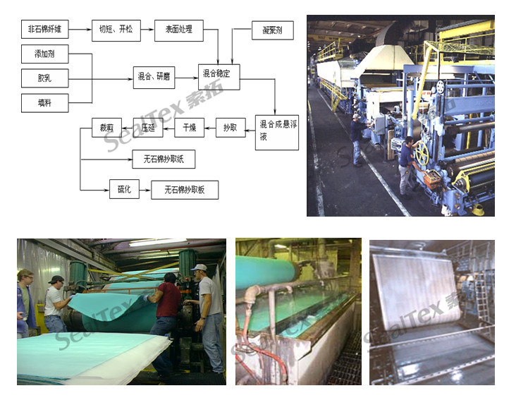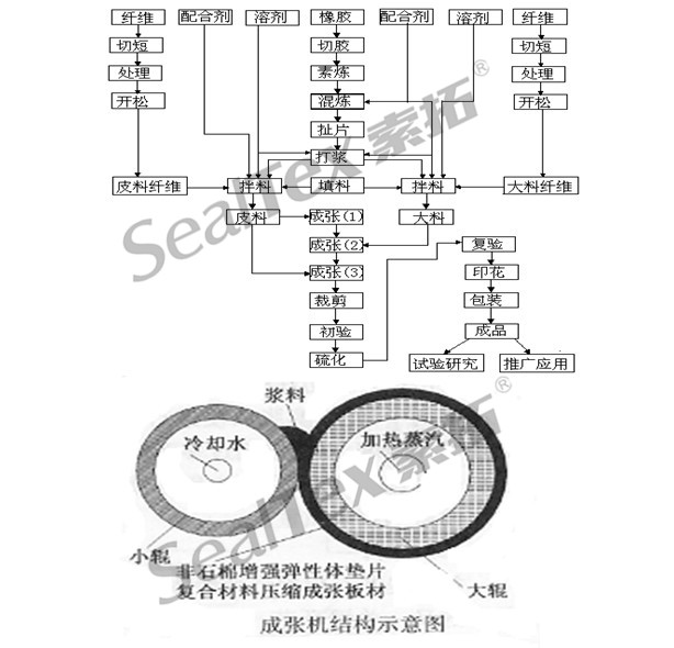 抄取工藝是一種類似造紙工藝的方法,當(dāng)初是在美國研發(fā)成功,用以生產(chǎn)石棉密封材料。美國的阿姆斯壯 Armstrong World Industry于80 年代研發(fā)成取代石棉的無石棉密封材料后,便一直使用抄取工藝而成為全球軟墊片材料的供應(yīng)商。用抄取工藝生產(chǎn)無石棉墊片材料在中國還是個(gè)新興工藝。在國內(nèi)的墊片材料的供應(yīng)商中,不到 10 家公司能成功生產(chǎn)真正不含石棉的無石棉墊片材料。下圖顯示的是生產(chǎn)無石棉墊片材料使用的抄取法工藝流程:
