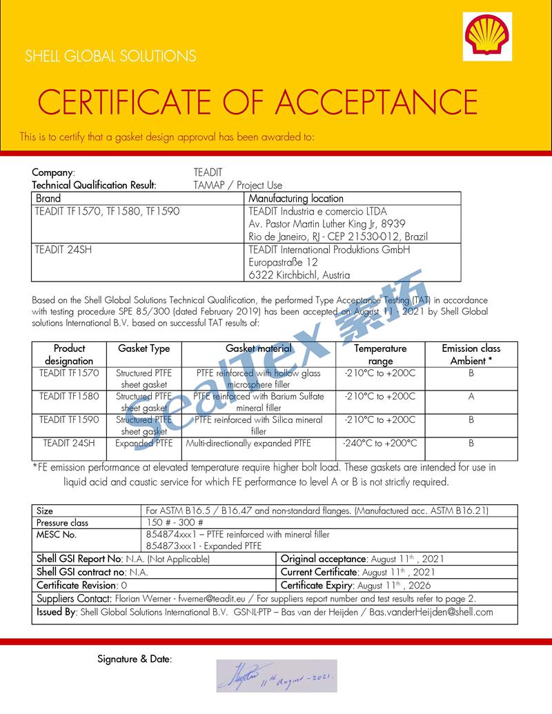 TEADIT/泰迪密封材料獲得石化巨頭殼牌SHELL認可