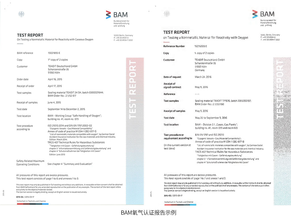 SealTex索拓合作品牌TEADIT泰迪如下型號(hào)具有BAM氧氣認(rèn)證測試報(bào)告: