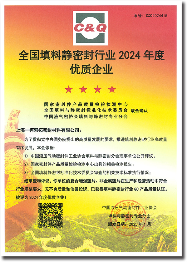 上海一柯索拓密封材料有限公司榮膺"全國(guó)填料靜密封行業(yè)2024年度優(yōu)質(zhì)企業(yè)"稱(chēng)號(hào),以創(chuàng)新密封技術(shù)驅(qū)動(dòng)產(chǎn)業(yè)未來(lái)。